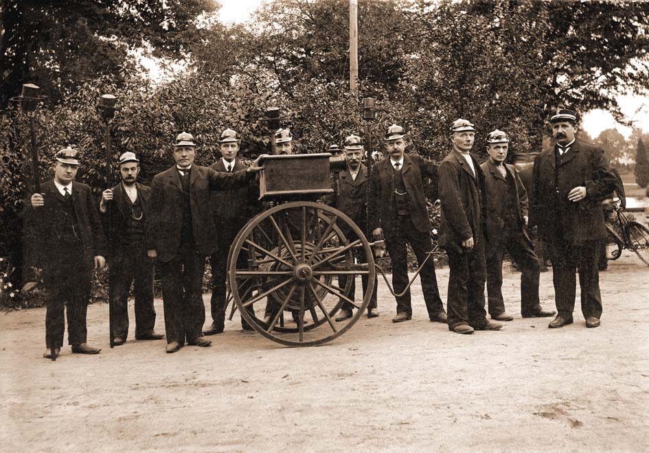 Slangenwagen no. 5 met uiterst rechts Albert Sanders jr. als brandmeester