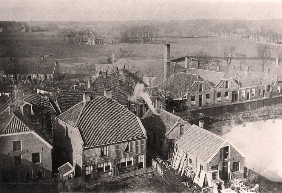 Op 22 maart 1893 nam J.B. van Heek deze foto vanaf het dak van de firma Van Heek & Co. Rechts ligt de koelvijver van zijn firma, op de achtergrond boerderij Zeggelt, en achter de schutting de Molensteeg met de firma A. Sanders & Zoon. Als we goed kijken zien we dat rechts achter Sanders al voorbereidingen worden getroffen voor de bouw van de St. Jozefkerk. Foto: Stichting Edwina van Heek.
