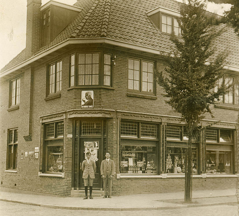 De nieuwe kruidenierswinkel aan de Leliestraat in Enschede. Dit was de voorloper van de bekende Twentse supermarktketen Sanders supermarkten.