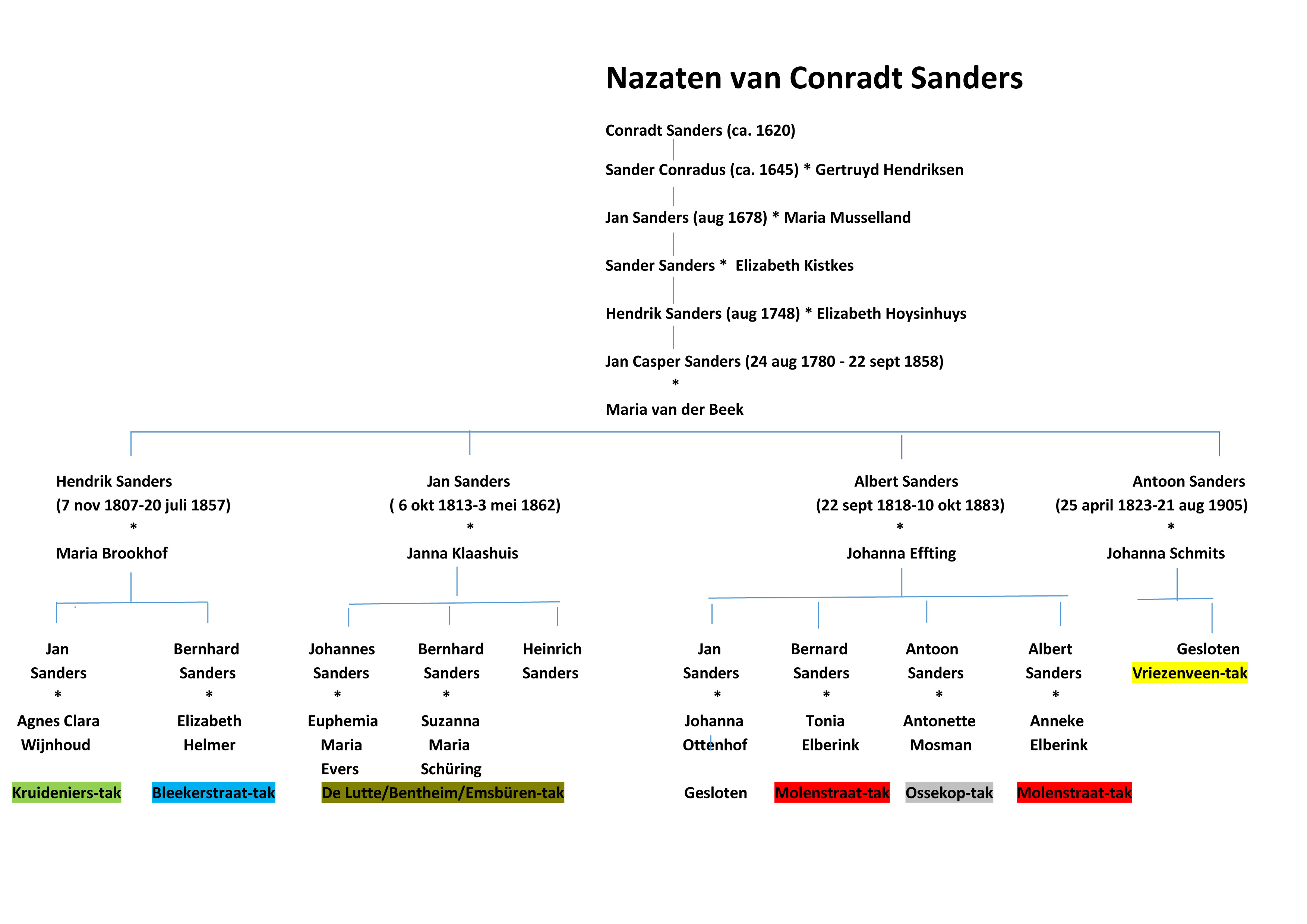 Uit het kadaster van 1832 blijkt dat Jan-Casper Sanders, naast zijn bezittingen in het dorp, vele percelen bouwland, weiland en gaardengrond buiten Denekamp bezat. Aan te nemen is dat hij zijn grutterij voorzag van graan van eigen land. Jan-Casper is twee keer getrouwd geweest. In 1804 trouwde hij voor de tweede keer, en wel met Maria van de Beek. Uit dit huwelijk werden vijf dochters en vier zonen geboren. Jan-Casper Sanders mag gezien worden als de stamvader van de huidige vier Sanders-takken, die rond 1900 in Enschede zoveel bedrijvigheid brachten.