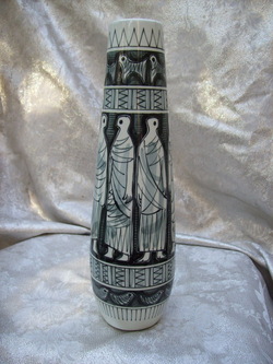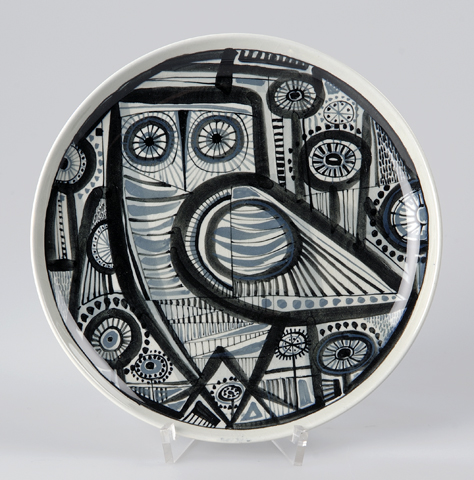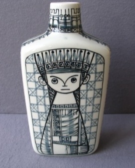 Herman Johannes Hendrikus Sanders was born in the Dutch industrial city of Enschede on 18th July, 1925. Following school, he went to the art industries school in Arnhem, where he trained as a stained glass artist and later a painter. He joined Porceleyne Fles as a Delftware-painter in 1948 and in 1950 completed his training at the Royal Academy for the Visual Arts, in The Hague. Early in his time at Royal Delft he was allowed to experiment with decorations on Delftware. Sandelfo was the name chosen for a new style of Delftware designed by Sanders. Produced from 1957 to 1977, the grey and black decoration featured modern and abstract figures. Some of the model forms related to traditional blue Delftware, but the majority of Sandelfo models used contemporary forms.