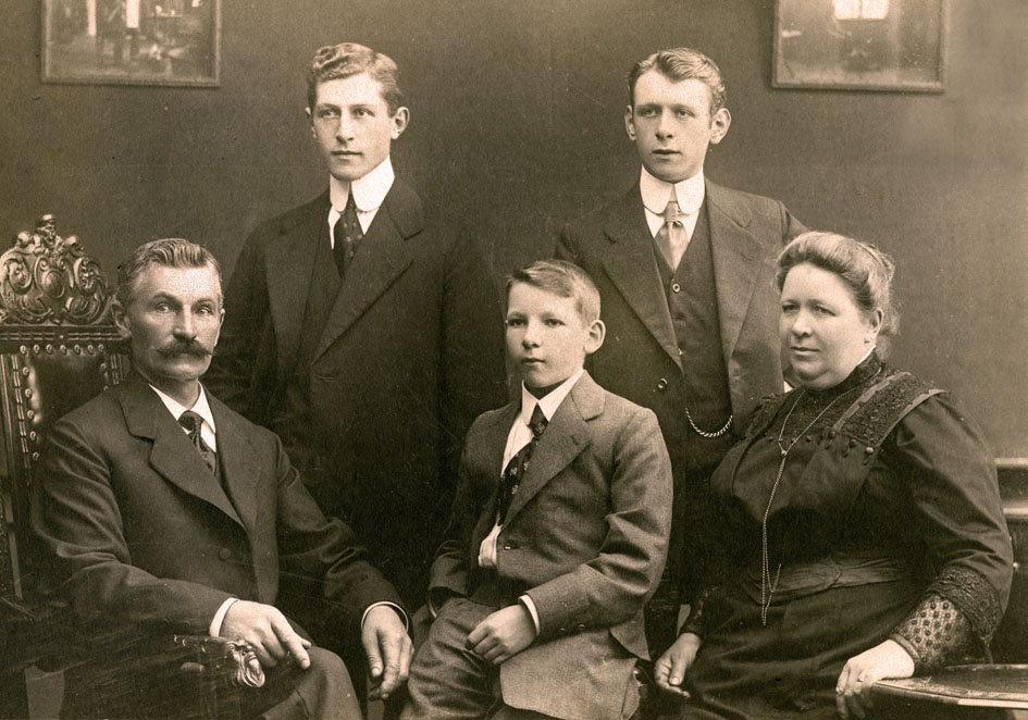 De familie Smulders-Kerkhofs. Van links naar rechts: Jan, Martien, Willem, Gerrit en Petronella.
