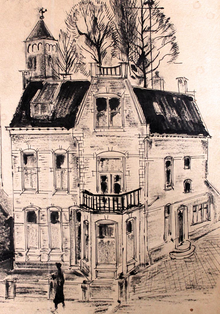 Perspectieftekening van het door Jan Smulders in 1910 gebouwde herenhuis aan de Oldenzaalsestraat 161. Na de tweede wereldoorlog werd dit huis verhuurd aan de arts J.H.Th Jansen. Deze koopt het huis eind jaren ’40 van de vorige eeuw. Tekening gemaakt door H. Franzen.