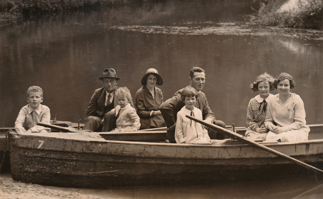 Martien Smulders samen met zijn zwager, Ben Michorius ( met hoed) en vier van zijn acht kinderen, vlnr : Jan, Nel, Riet en Trees. De twee dames rechts zijn onbekend. Voor het Watersportpark werd destijds roeiboten en kano’s aangeschaft.