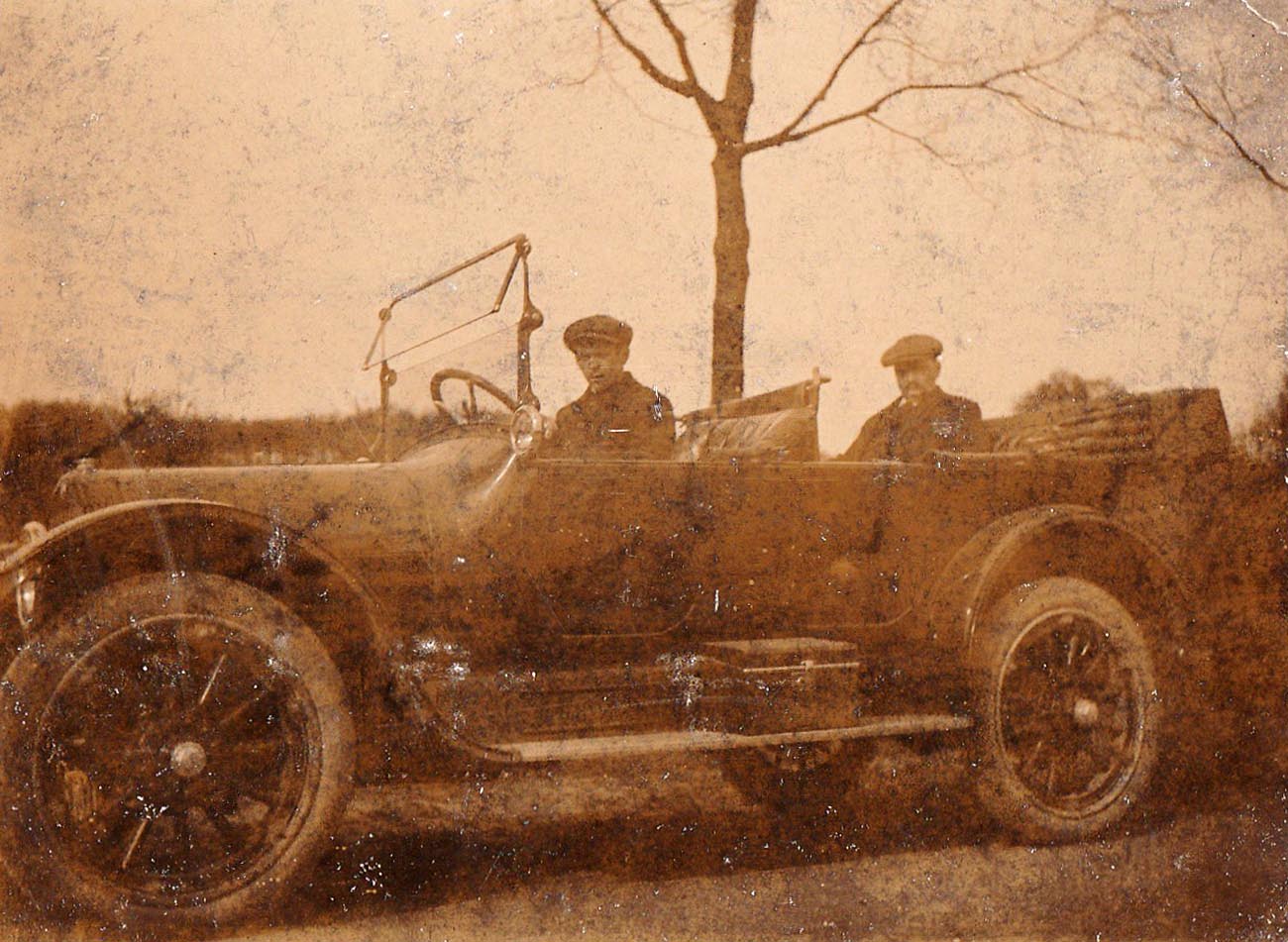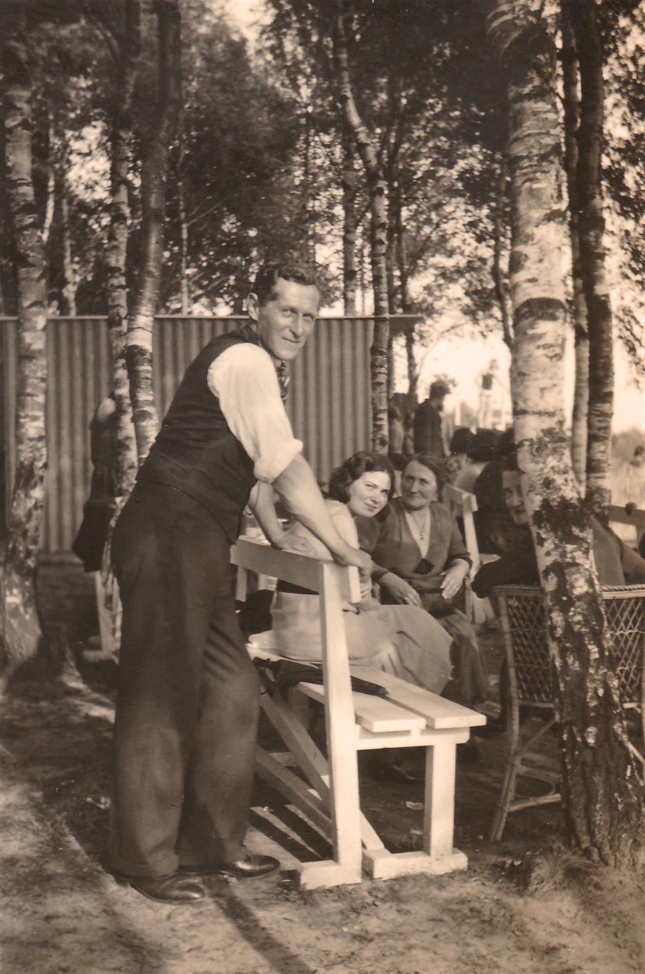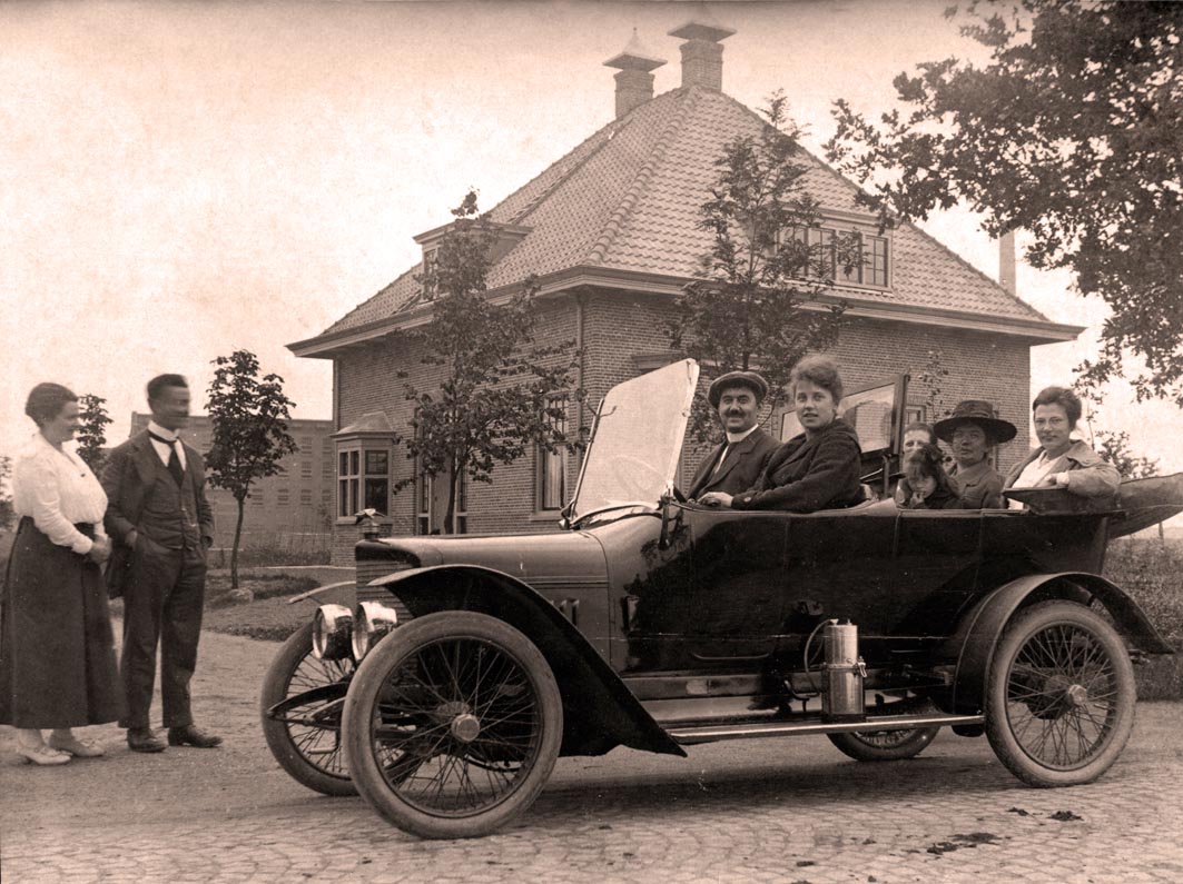 Hein Sanders met zijn vrouw Truus de Bruijn ( achterin met hoed) op bezoek bij de familie Smulders. Achtergrond de steenfabriek en het nieuwe herenhuis van Martien en Jo Smulders-Michorius .