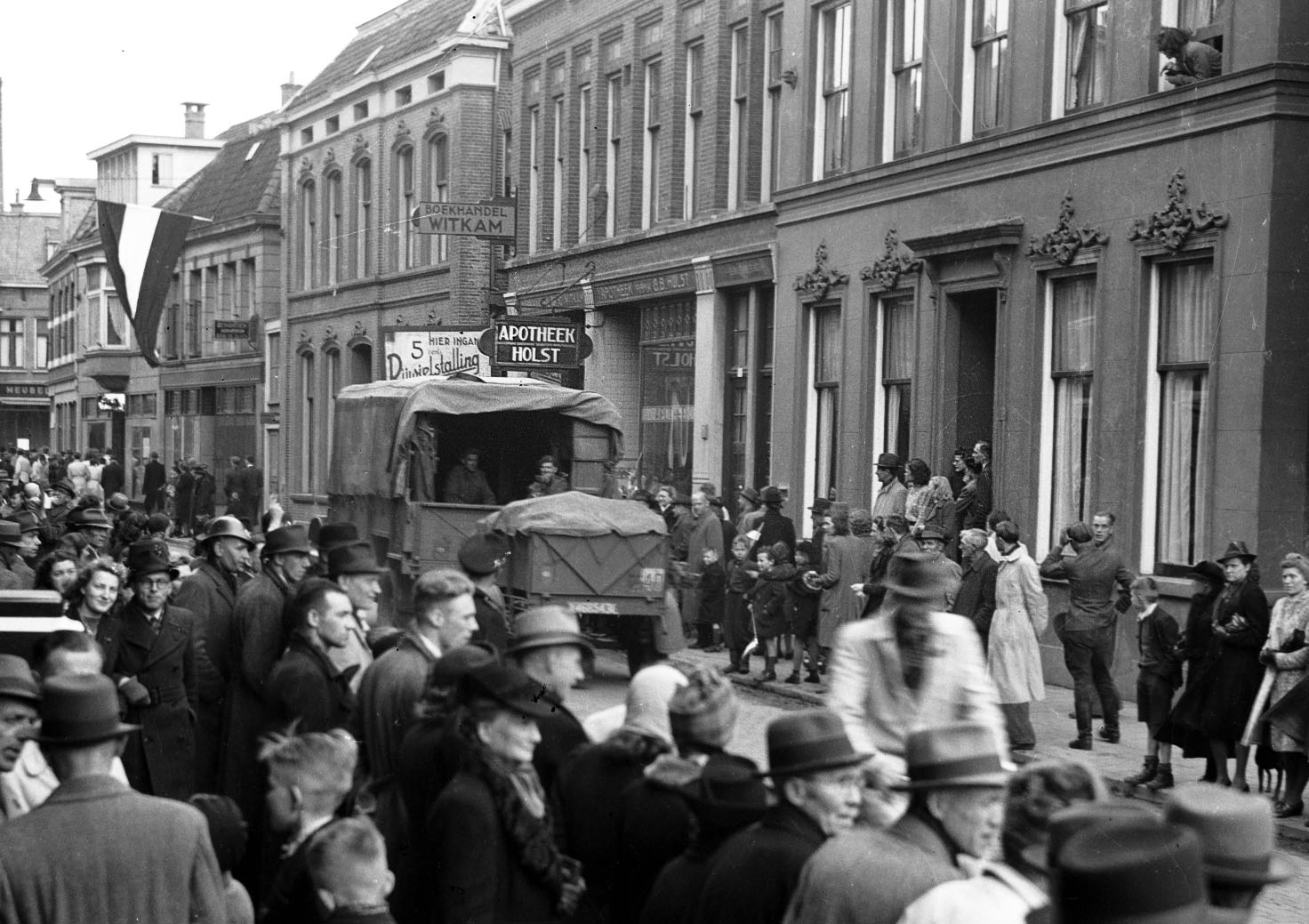 De familie Smulders, hier staande in het portiek van het huis aan de Gronausestraat nr. 10, tijdens het voorbijtrekken van Engelse soldaten na de bevrijding. Foto: Fotoarchief Brusse Enschede