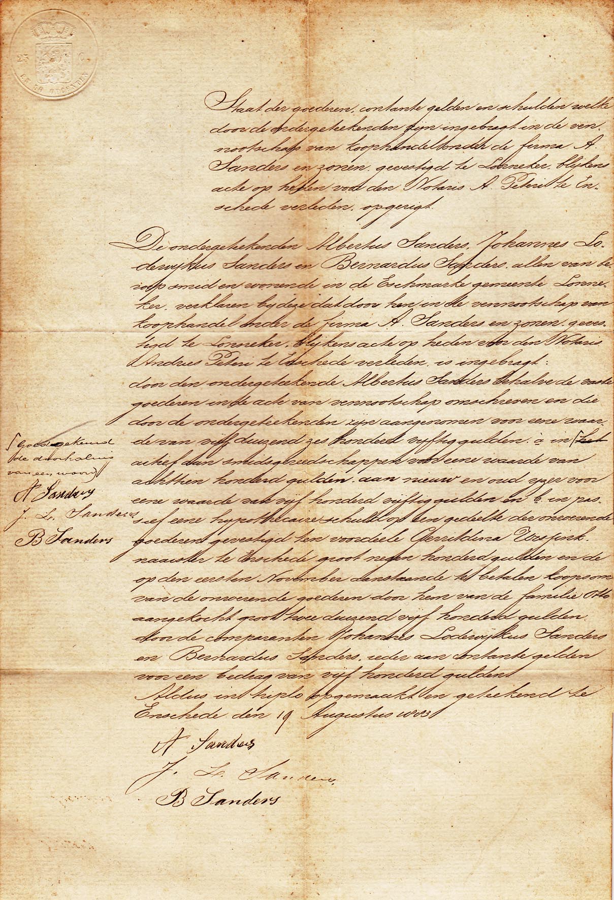 Sanders van de familie Otto aangekocht groot ƒ2500,-. Door Jan Sanders contant ingebracht ƒ500,-. Door