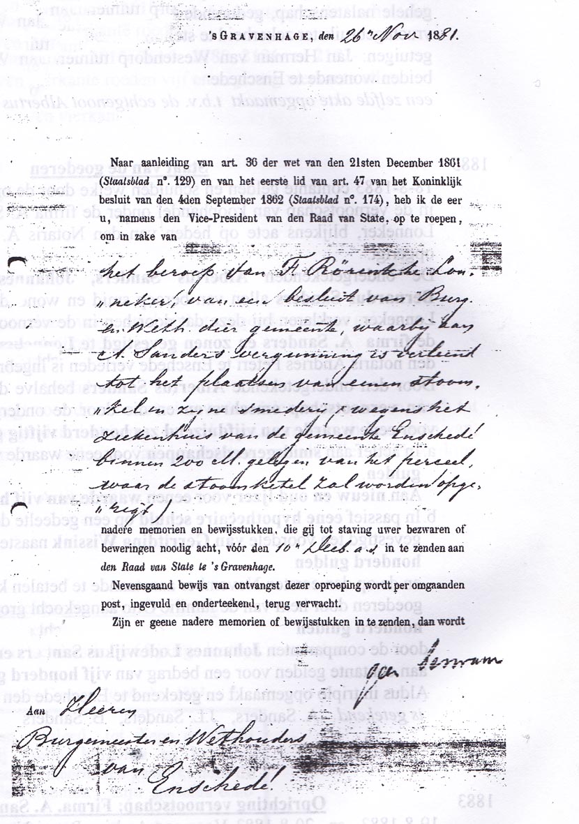Op 22 juni 1884 werd door de firma A. Sanders & Zonen een vergunning