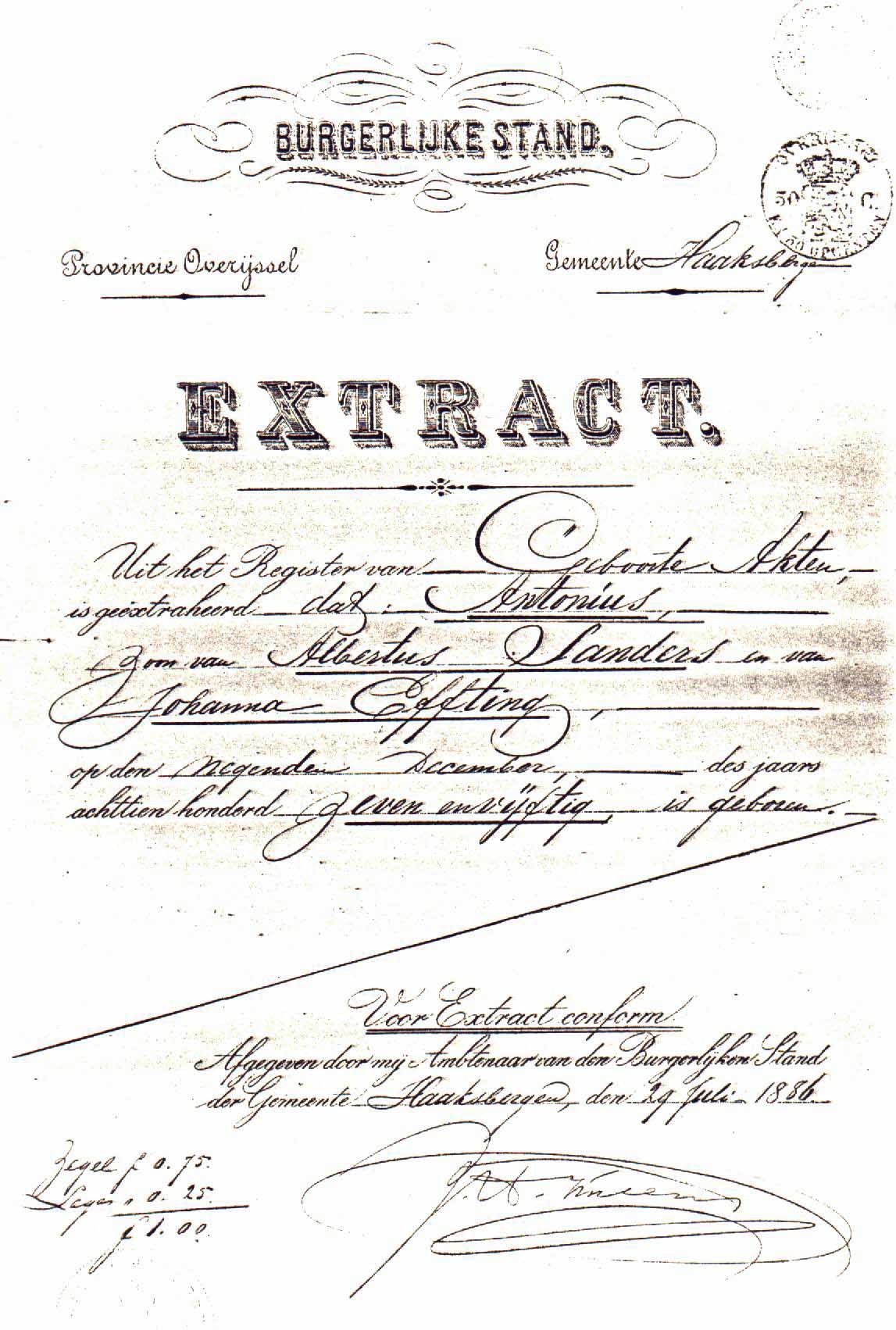 Uittreksel geboorteregister Antonius Sanders, Juli 1886. Benodigd voor huwelijk met