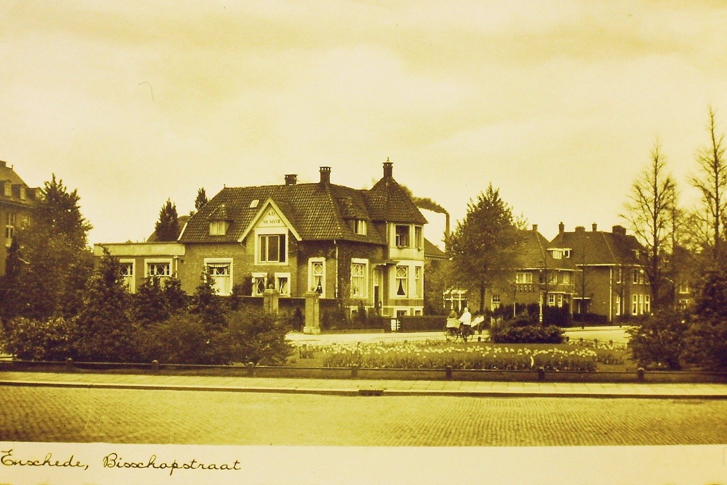 Bisschopstraat, het huis rechts van de rokende schoorsteen werd bewoond door mevr.Sanders-Mosman.