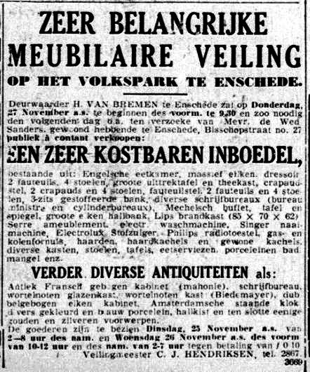 Henk Bak liet in 1941 de inboedel van het huis van zijn schoonmoeder veilen.