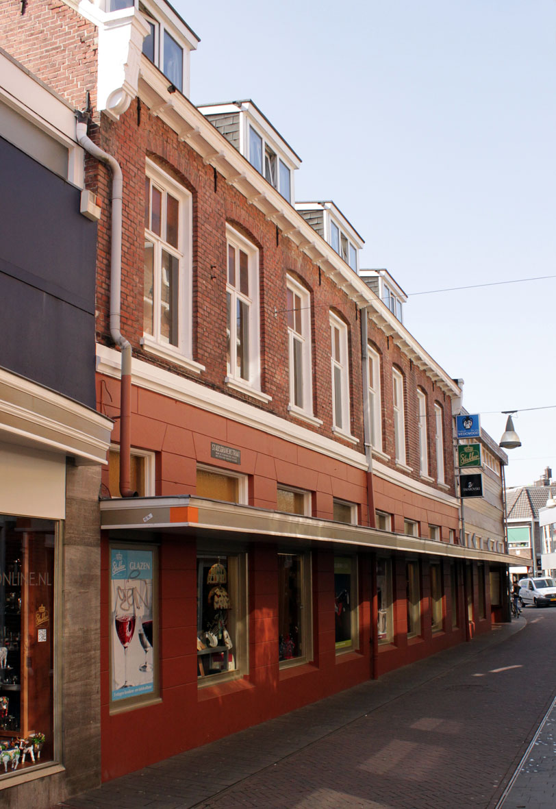 Dit pand werd in 1912 gebouwd als magazijn (B). De rechter bovenwoning werd door Albert en Dora Sanders bewoond. Later heeft de familie het magazijn verhuurd aan Emma de Beer die hier een meubelzaak bedreef. Foto Maart 2012.