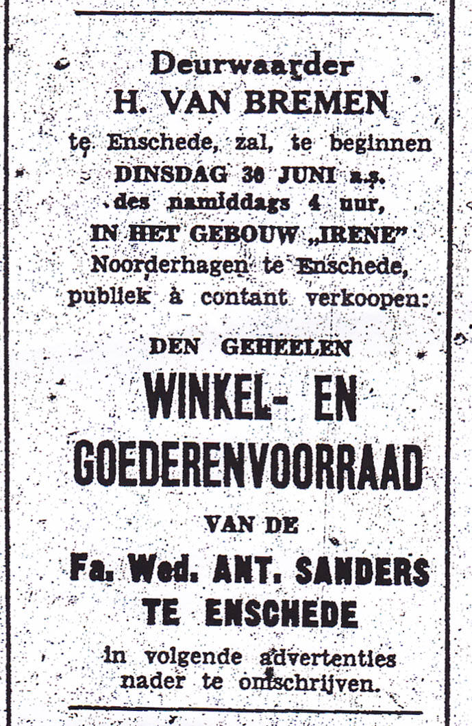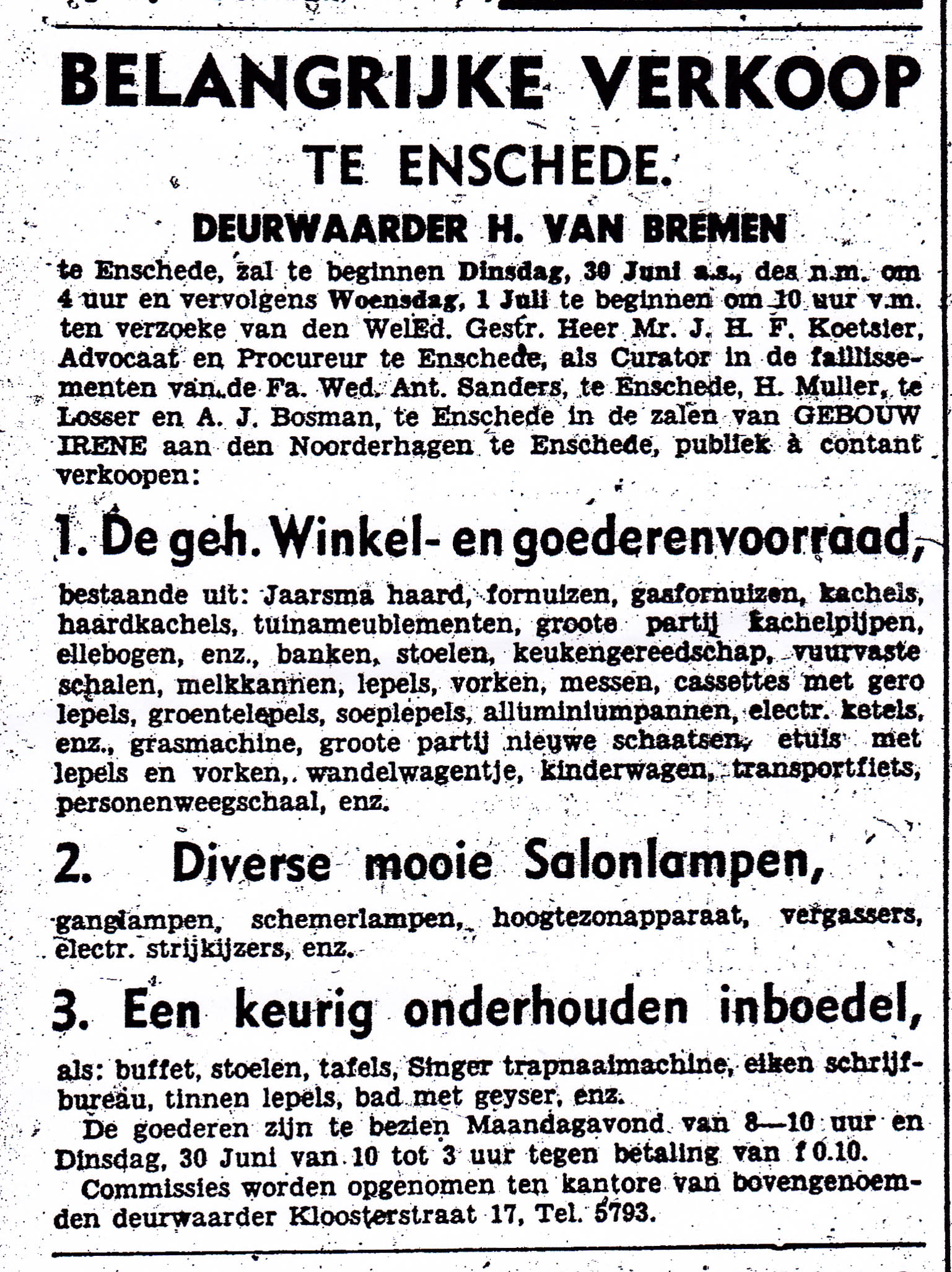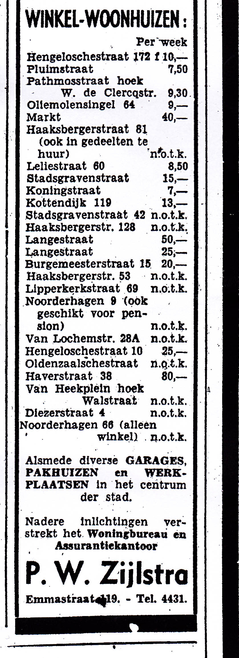 Advertentie in de Tubantia van 24 juli 1936. Hier zien we dat de familie de panden Haverstraat 38 en Stadsgravenstraat 42 te huur aanbied via het bekende makelaarskantoor Zijlsta, het huidige Snelder-Zijlstra.
